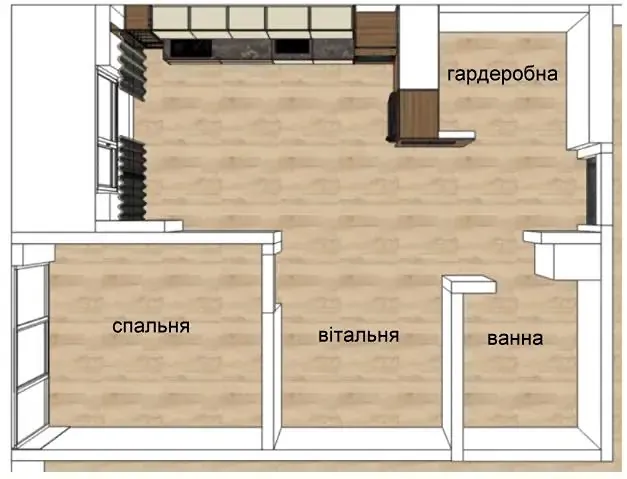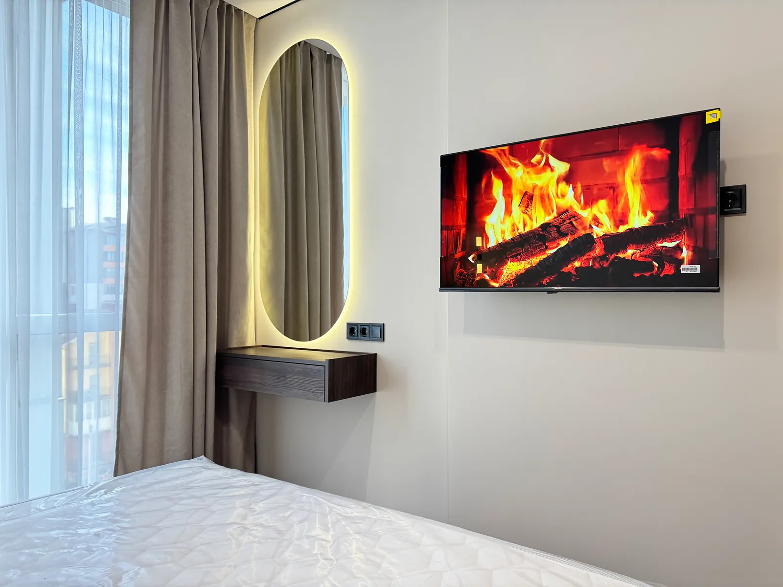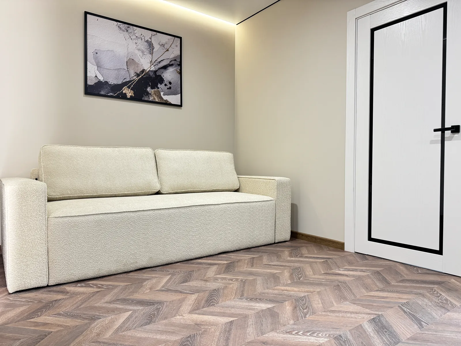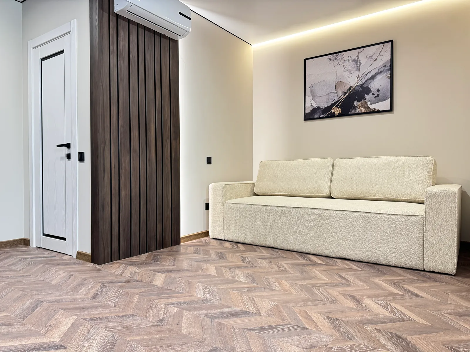 Квартира розташована на шостому поверсі та має функціональне планування площею 42.5м2. Воно включає в себе простору кухню, санвузол, окрему спальню та простору зону вітальні з диваном та телевізором. В квартирі зроблений якісний ремонт, при якому використовувались лише якісні та надійні будівельні матеріали.