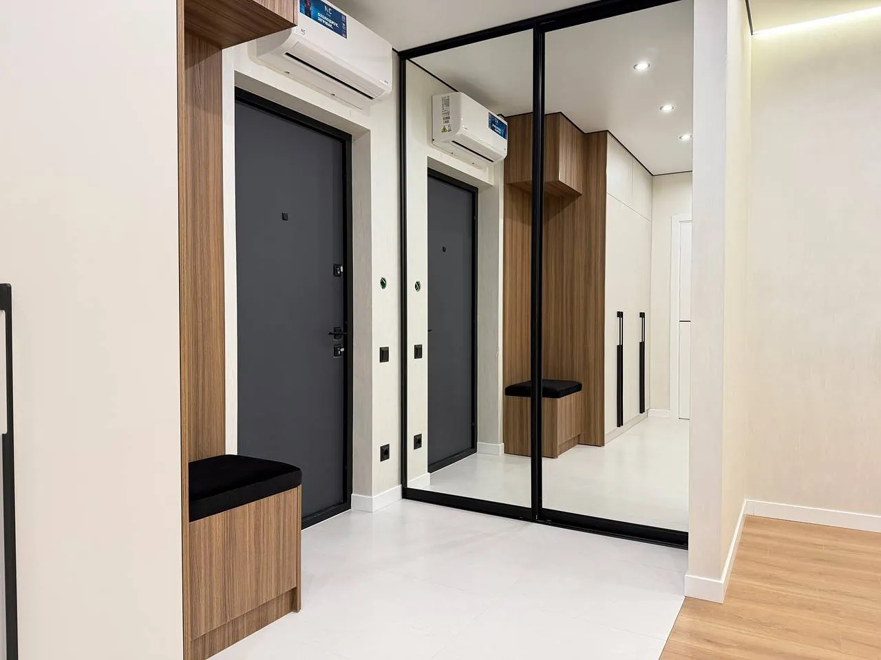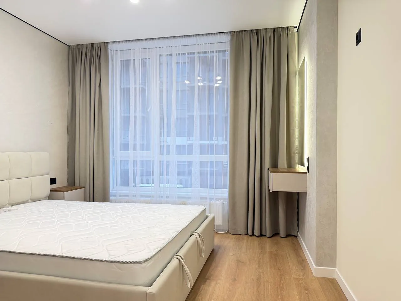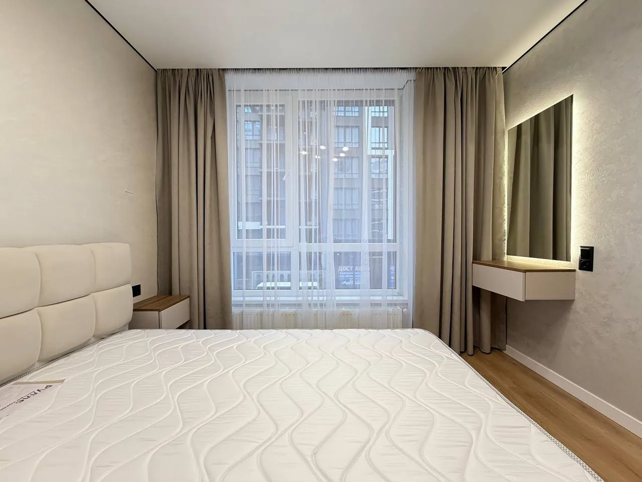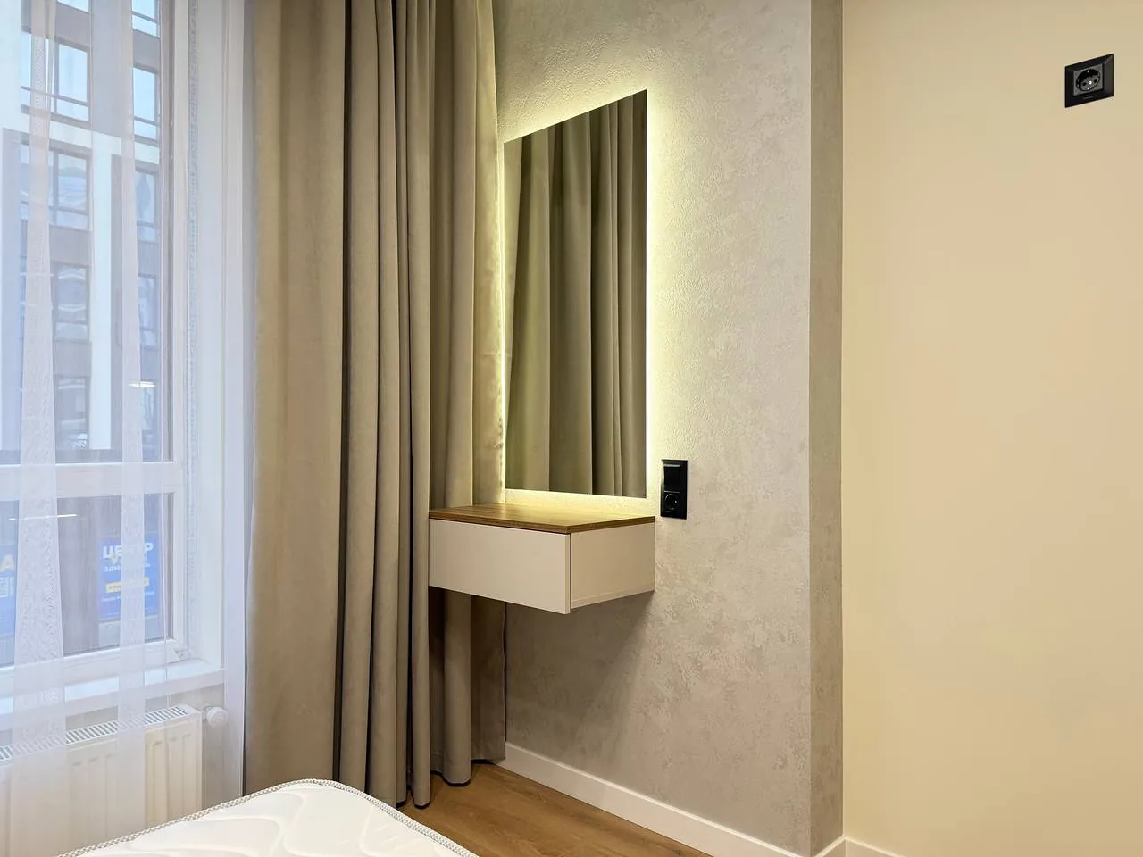 У квартирі відмінне планування: простора кухня з укомплектованою робочою частиною, зона вітальні з диваном , спальня з ліжком, приліжковими тумбами та бʼюті зоною, передпокій з та великий санвузол.