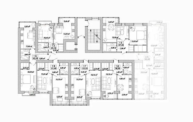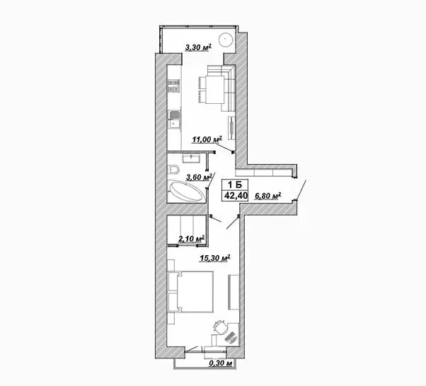 Квартира має загальну площу 41м2, вона має велику спальню, просторий коридор, ванну кімнату, гардеробну, та світлу кухню з виходом на лоджію.