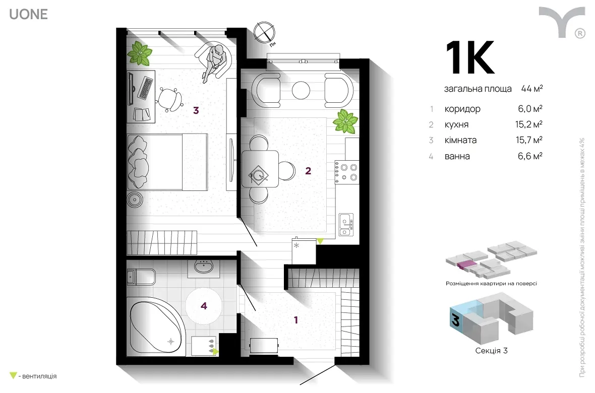 Квартира має загальну площу 41м2 та розташована на комфортному поверсі з тринадцяти.