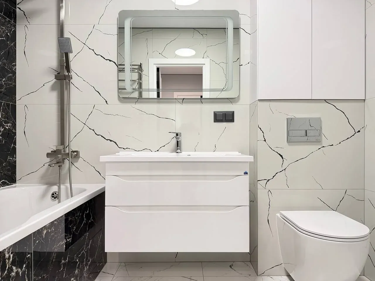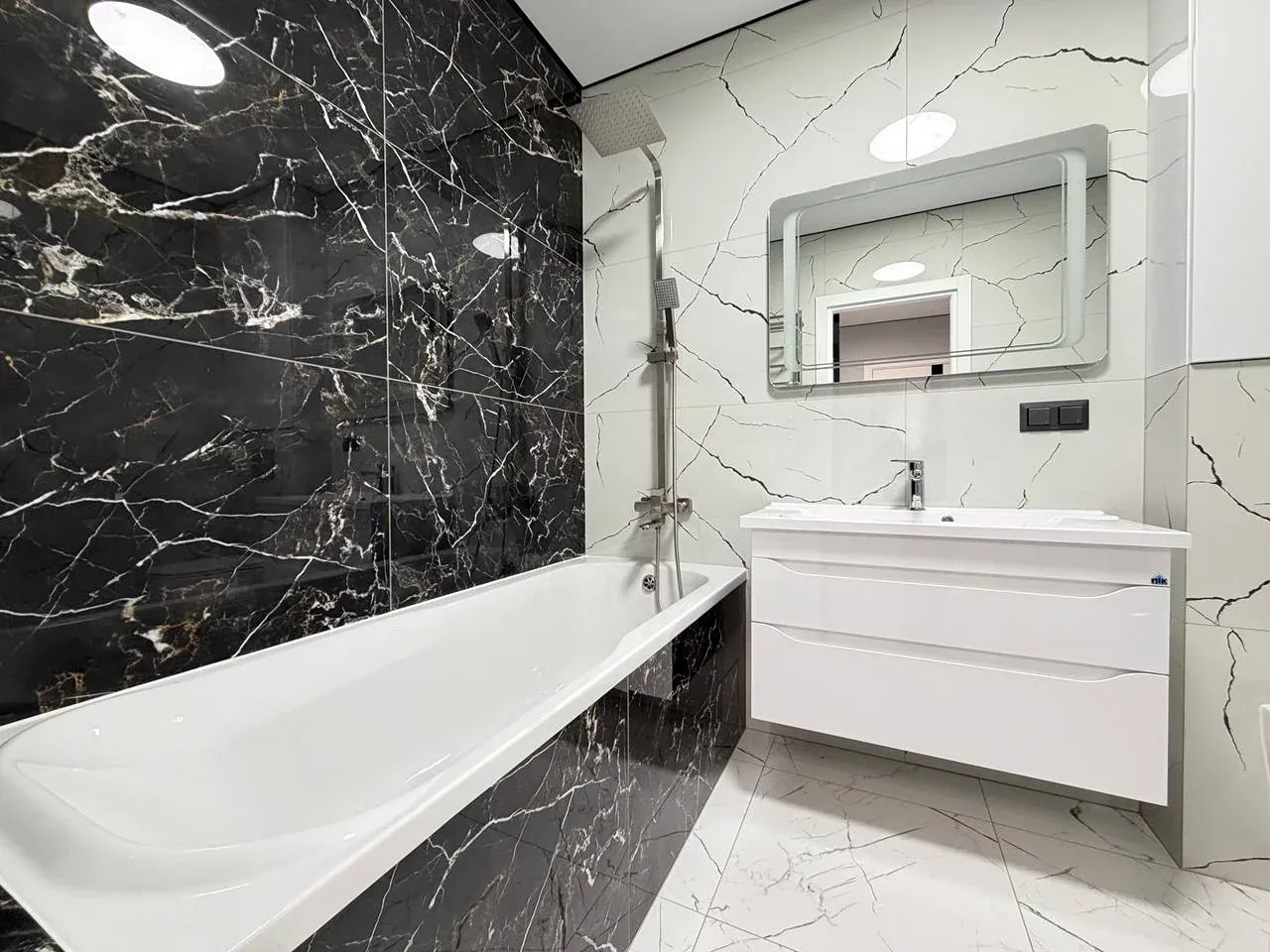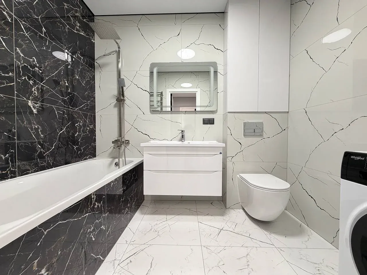 Cтильна ванна кімната з ванною та душовою зоною