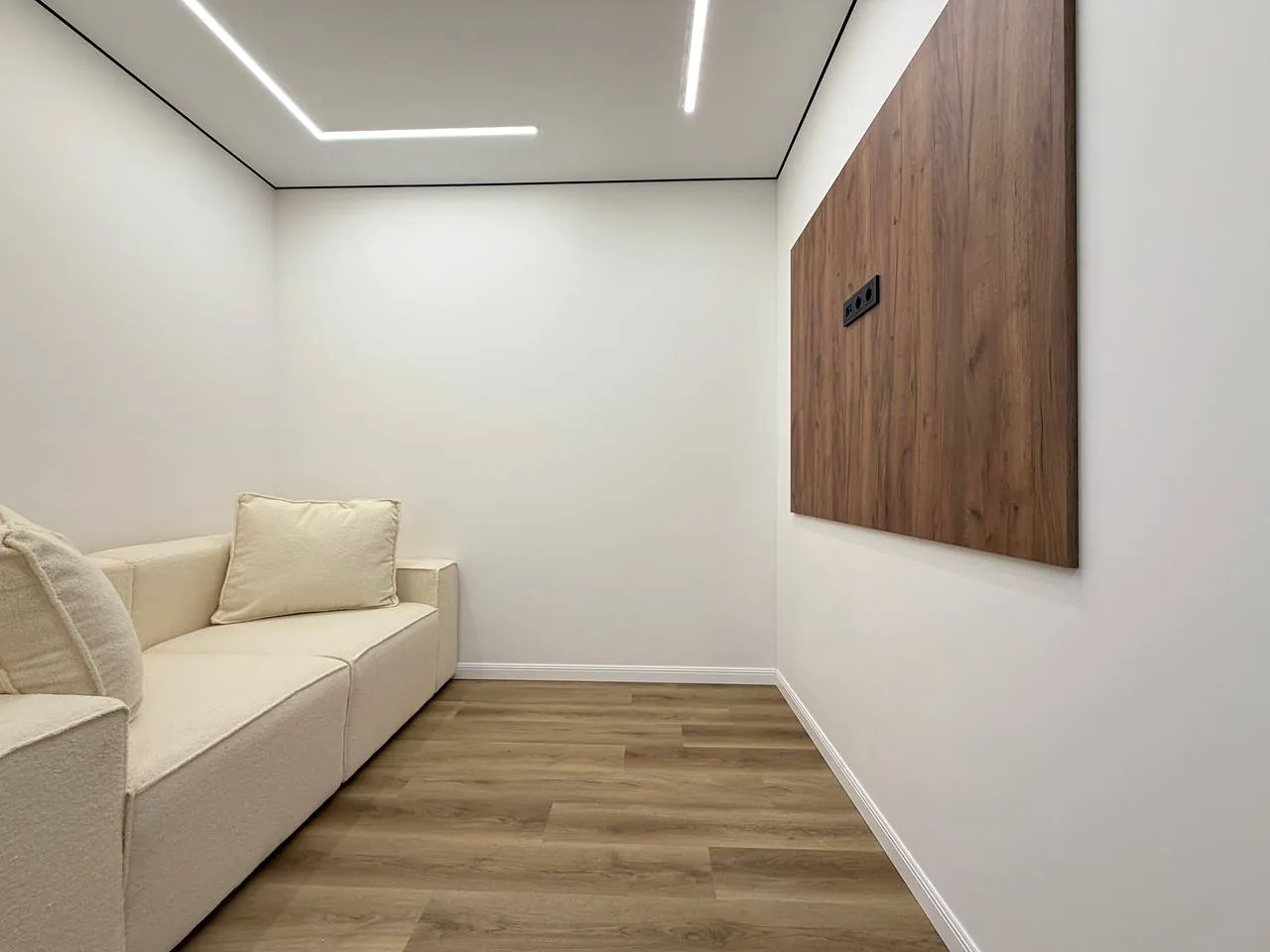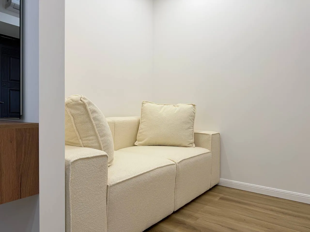 Квартира має функціональне планування загальною площею 55м2 що включає в себе: передпокій, санвузол, зону вітальні, спальню з виходом на лоджію де облаштували робочу зону, та простору кухню з лоджією та виглядом у внутрішній двір.