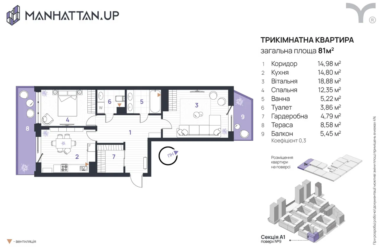 Квартира розташована на зручному девʼятому поверсі з тринадцяти та має загальну площу79м2. Вона двостороння, з виглядом у внутрішній двір житлового комплексу та на міське озеро і гори.