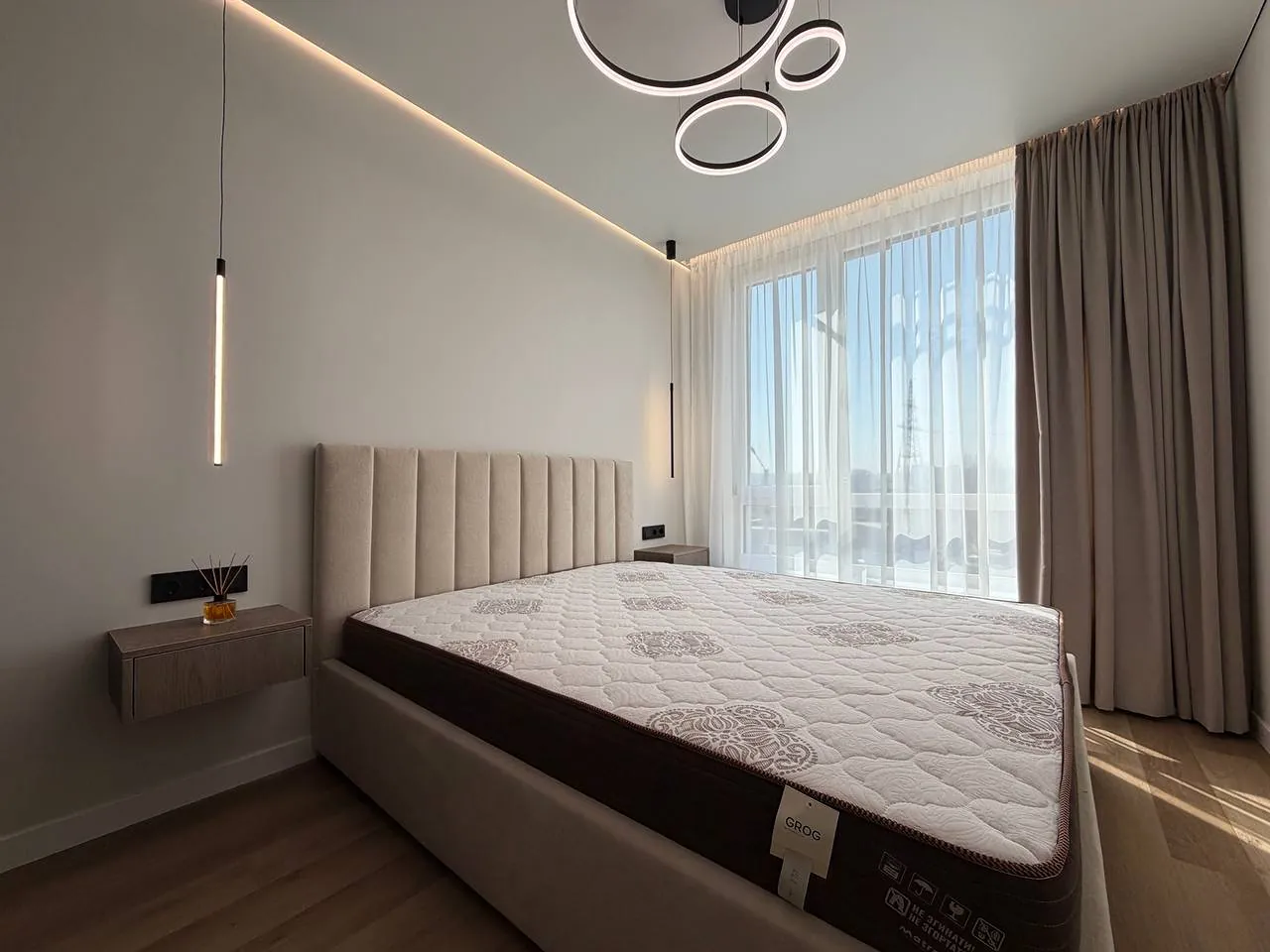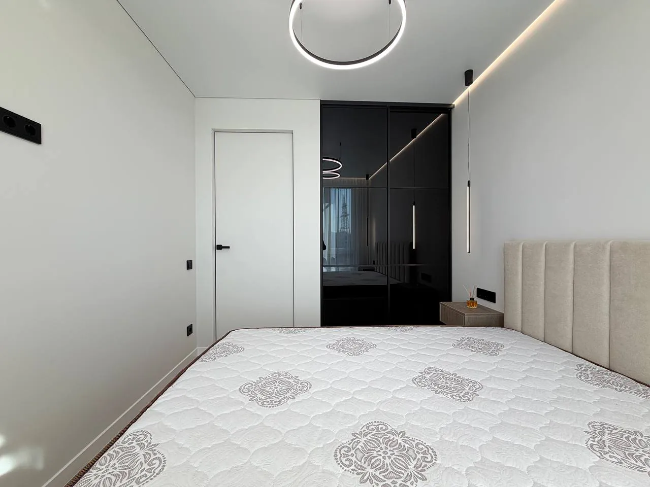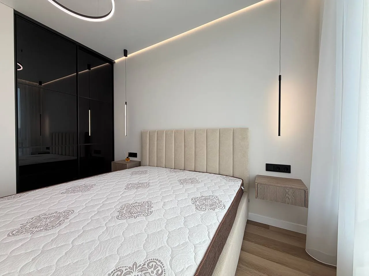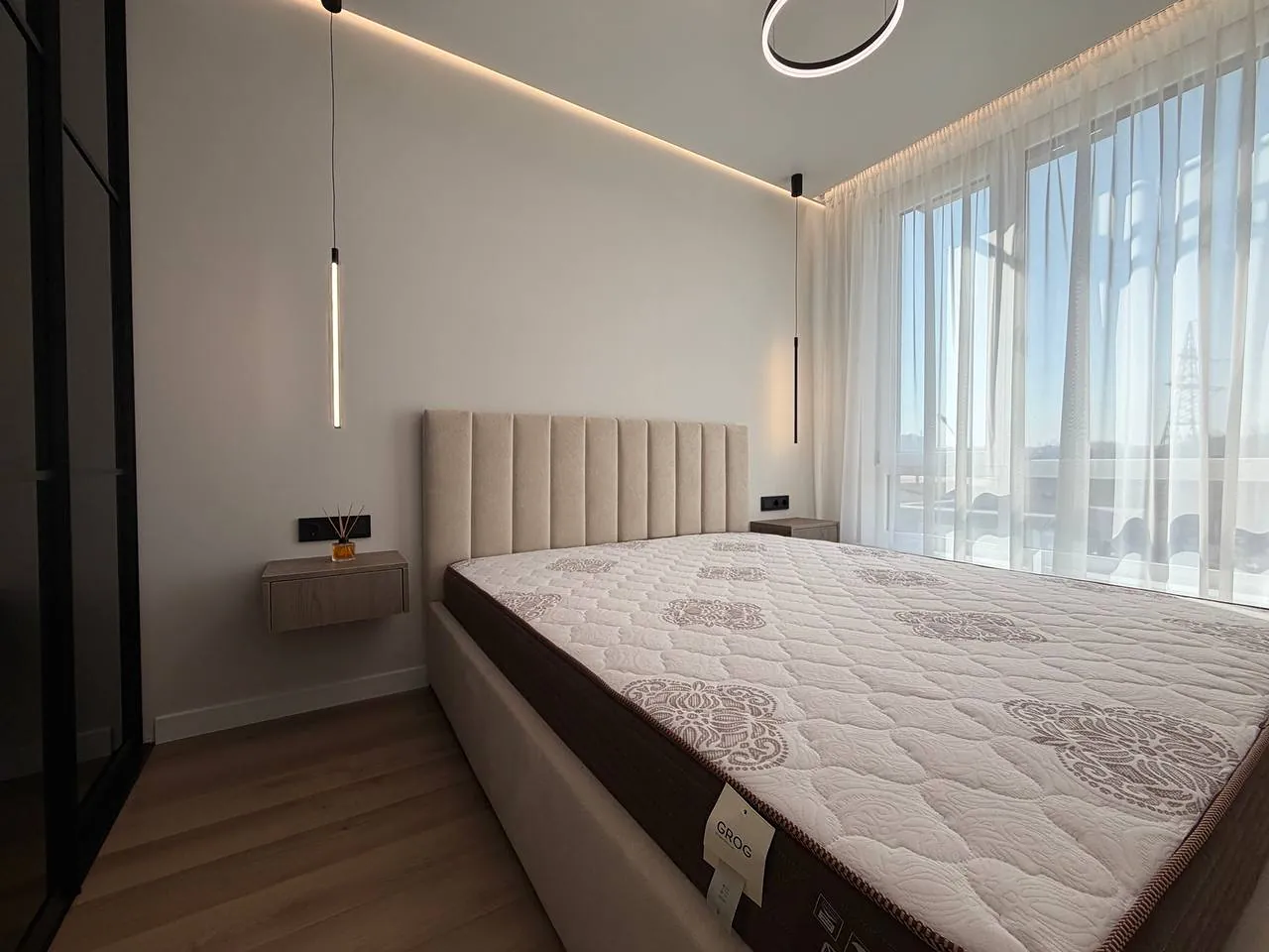 На кухні вмонтована вся необхідна техніка та меблі. В спальні є двоспальне ліжко з підйомним механізмом, приліжкові тумби та місце для телевізора.