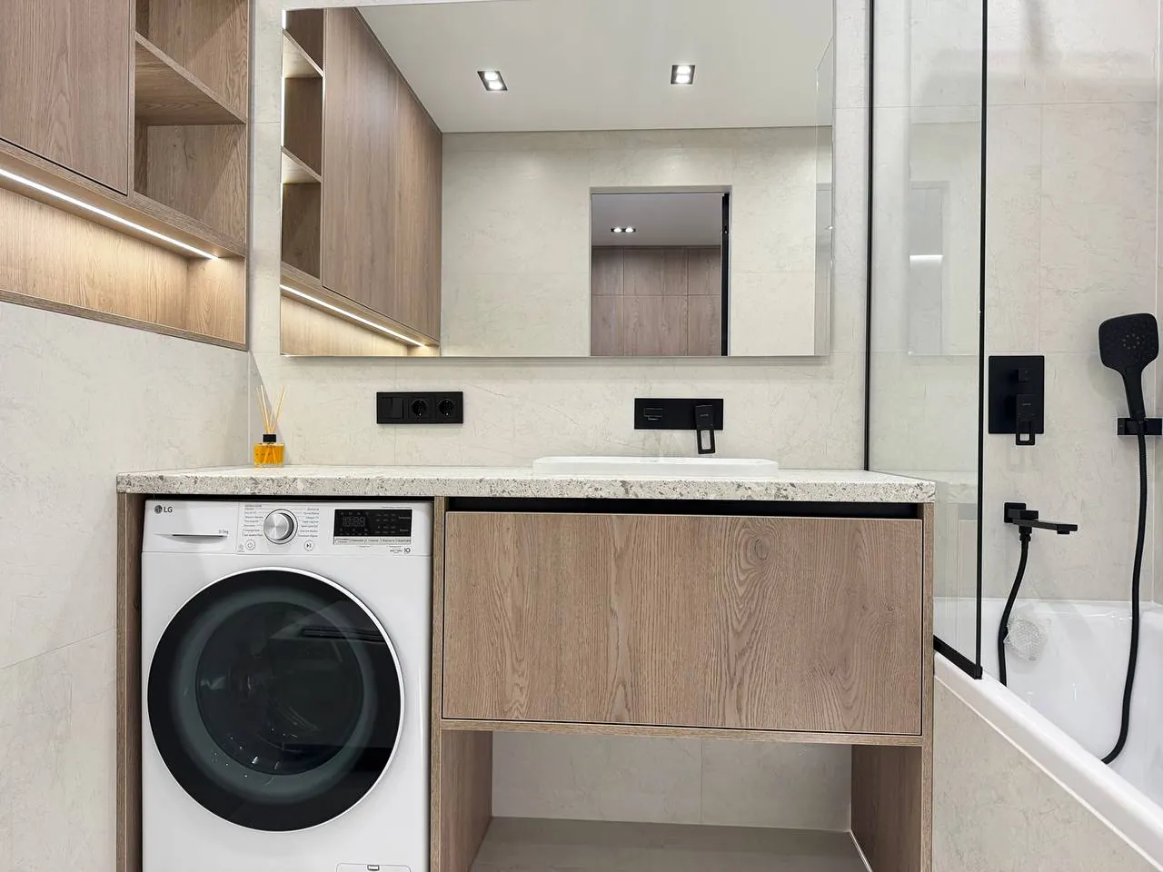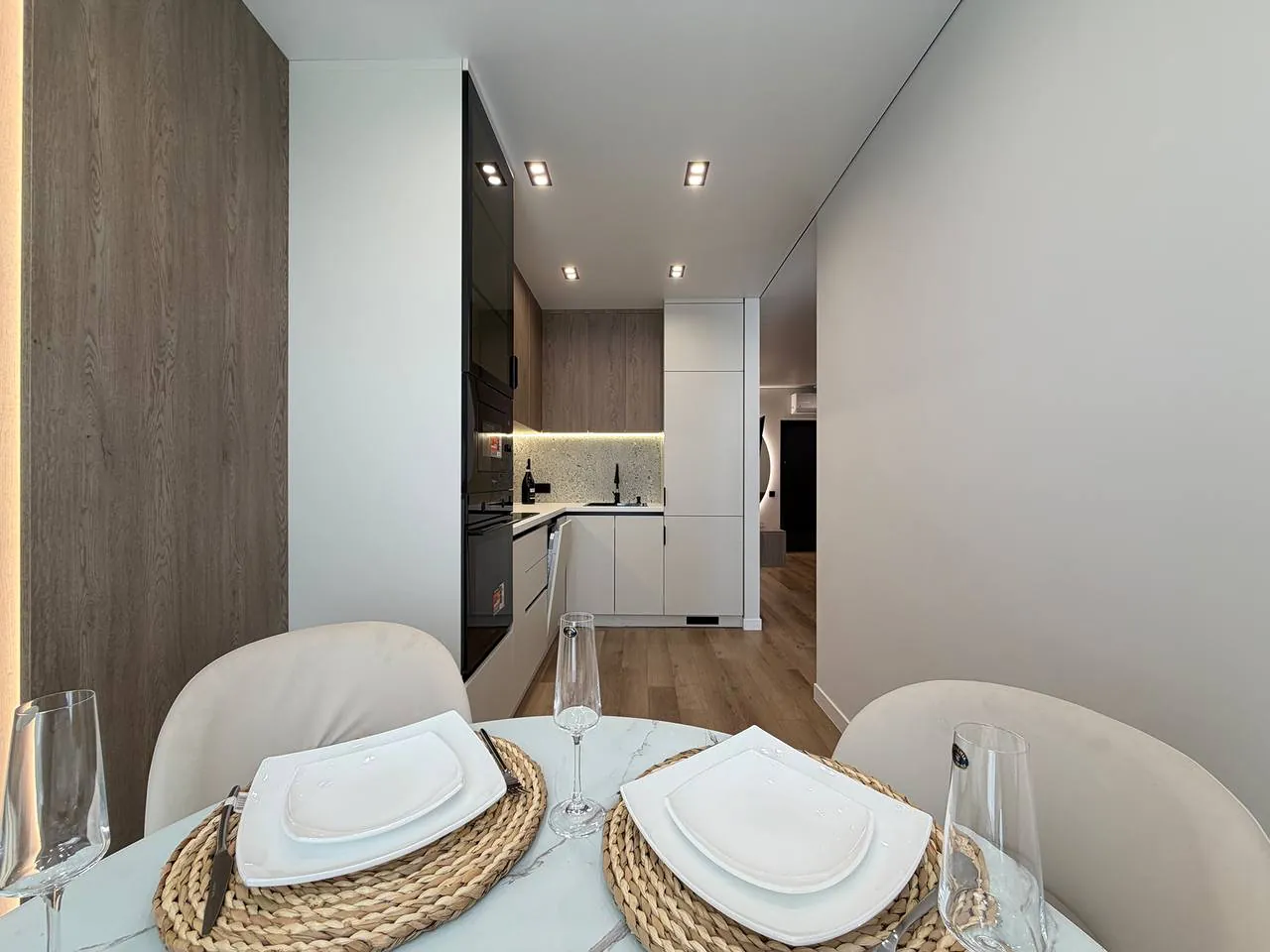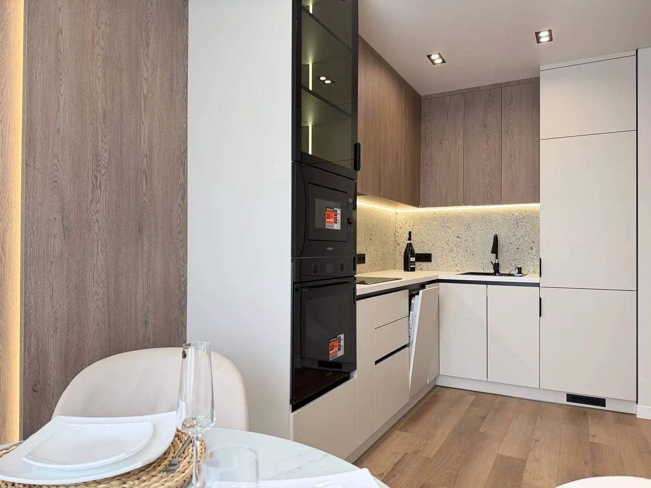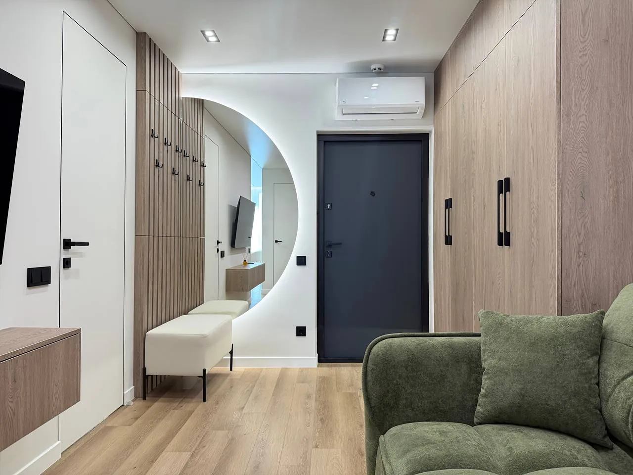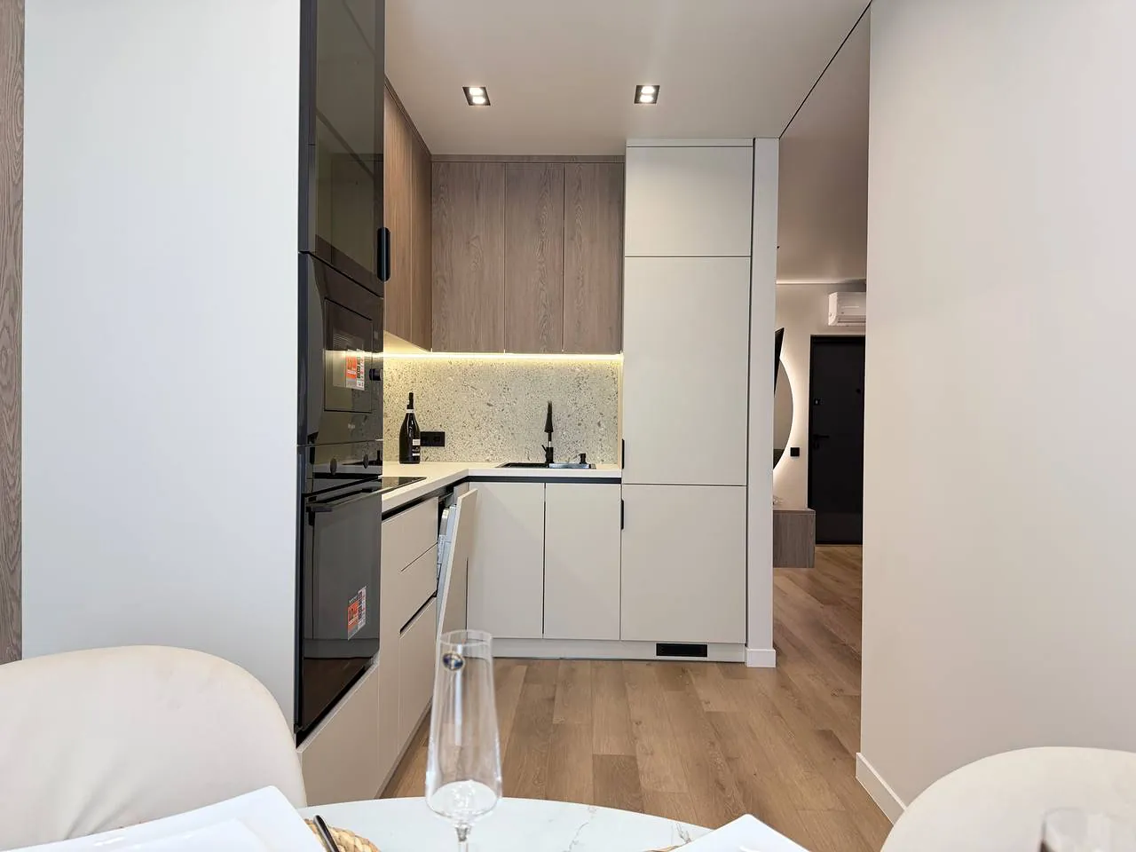 На кухні вмонтована вся необхідна техніка та меблі. В спальні є двоспальне ліжко з підйомним механізмом, приліжкові тумби та місце для телевізора.