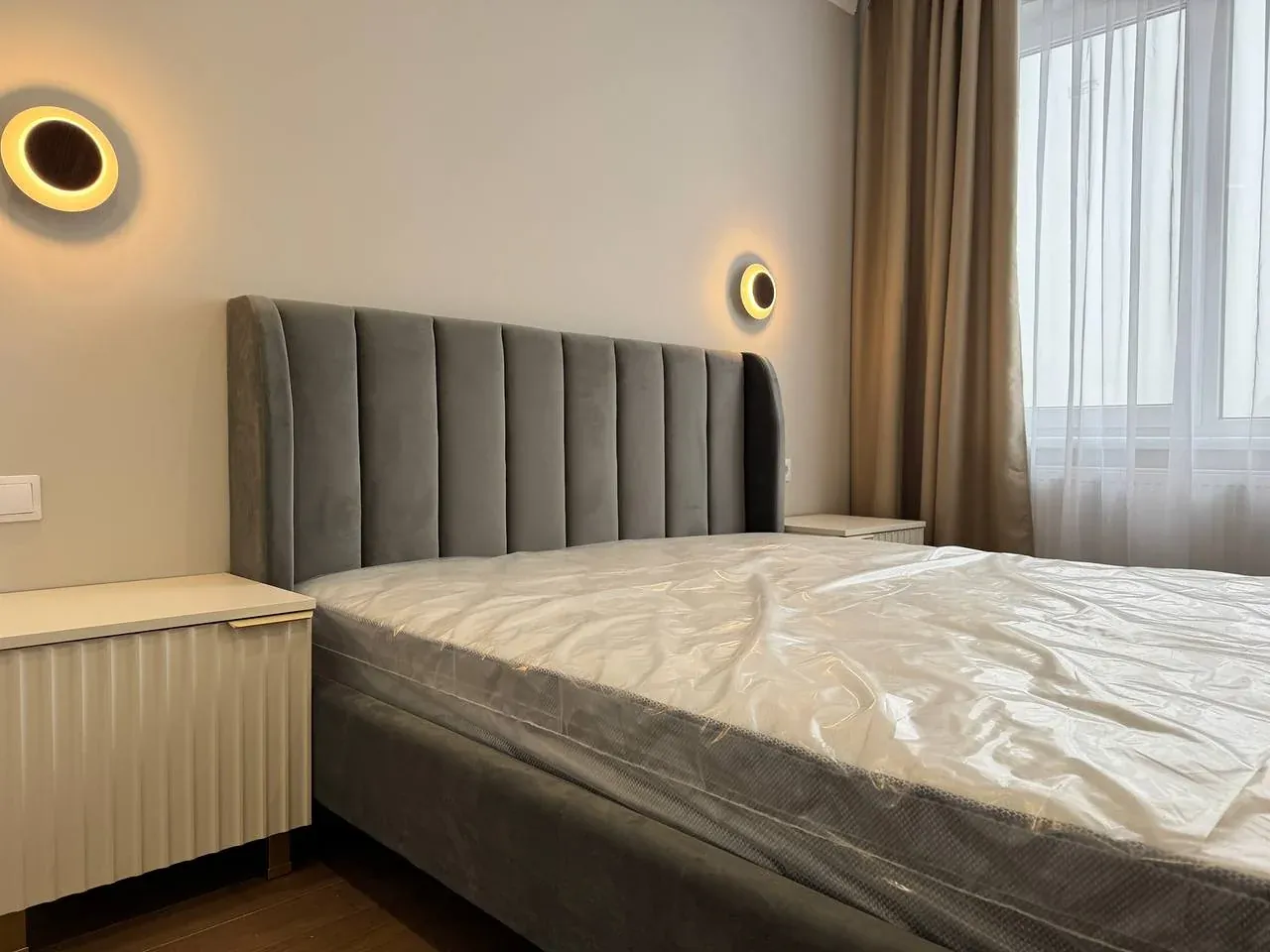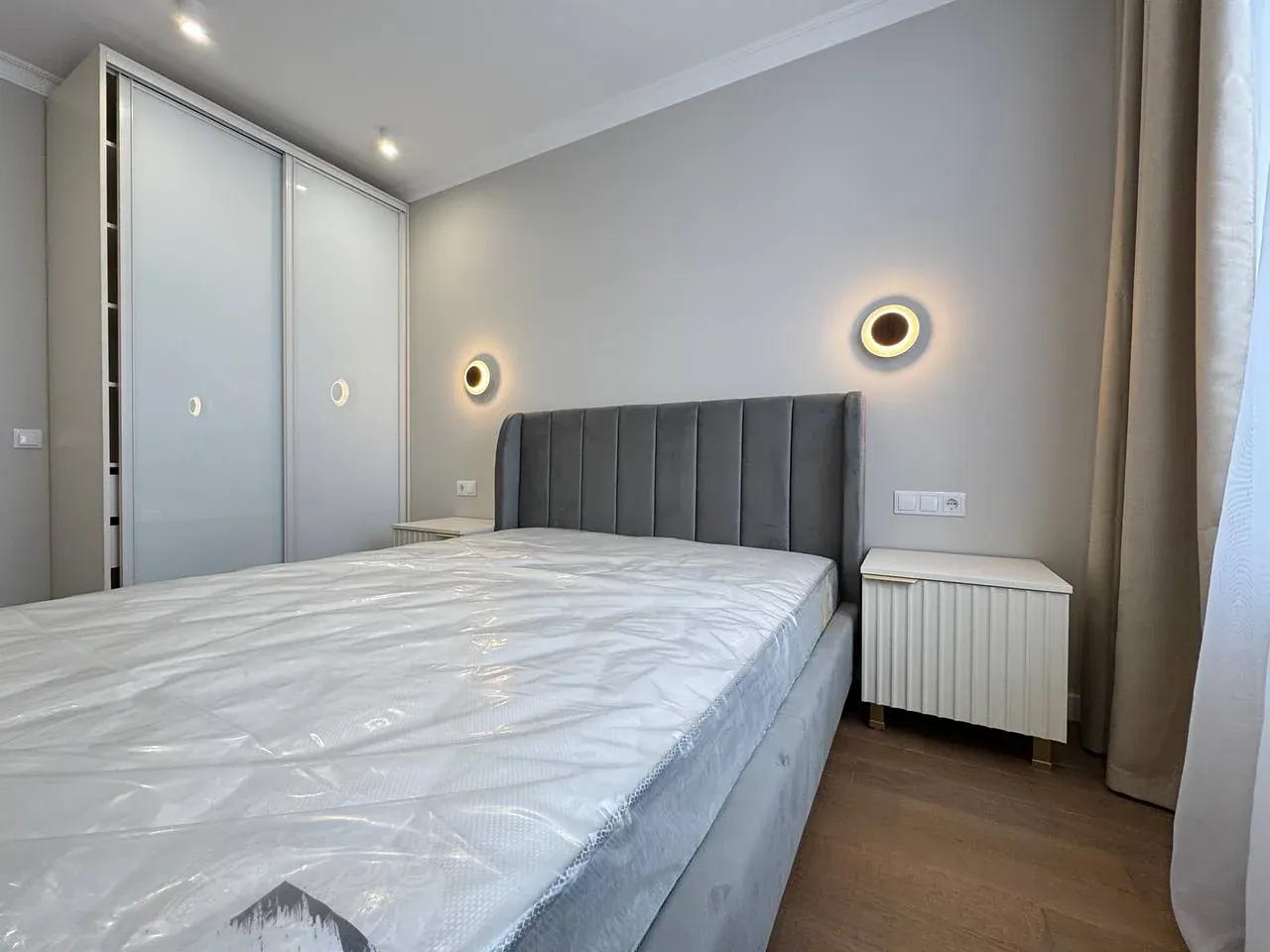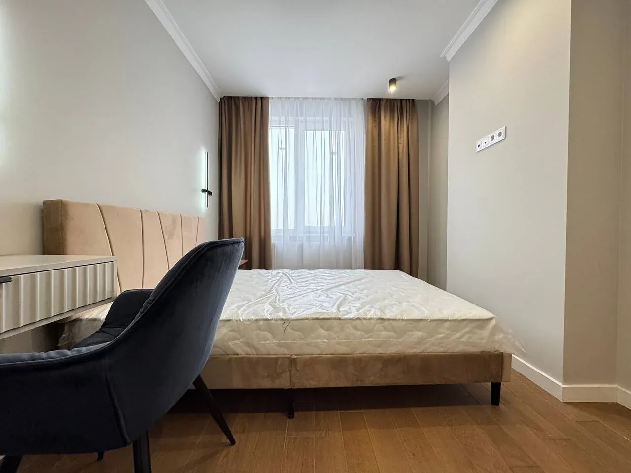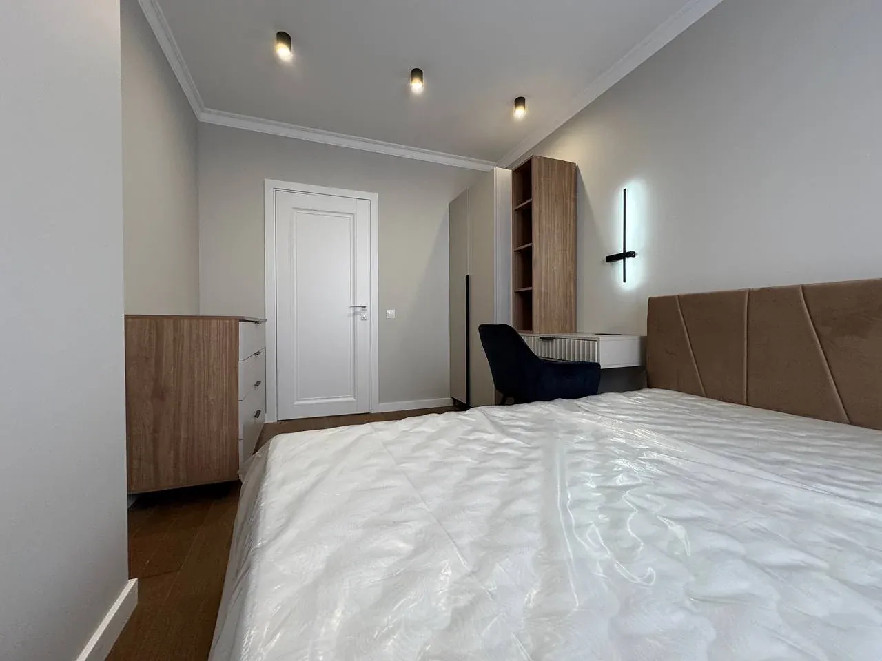 У другій спальні є ліжко, приліжкові тумби, шафа, бʼюті зона.