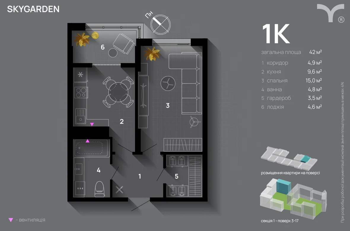 Квартира внутрішня та світла, має функціональне планування загальною площею 42м2, Воно включає в себе: прихожу, санвузол, гардеробну, кухню з виходом на балкон та простору спальню.