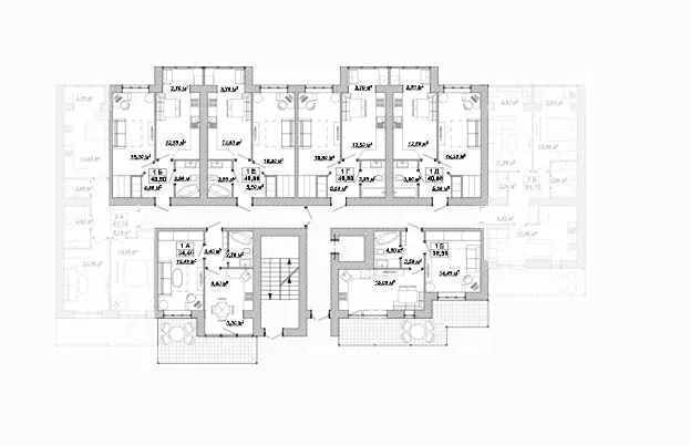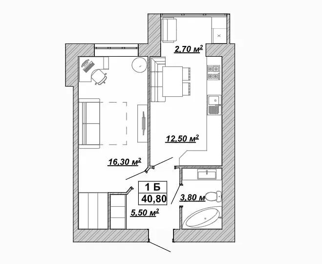 Квартира має загальну площу 40.8м2, вона має велику спальню, просторий коридор, ванну кімнату, гардеробну, та світлу кухню з виходом на лоджію.