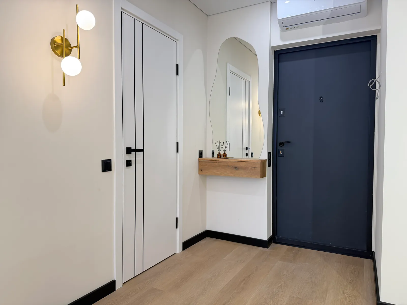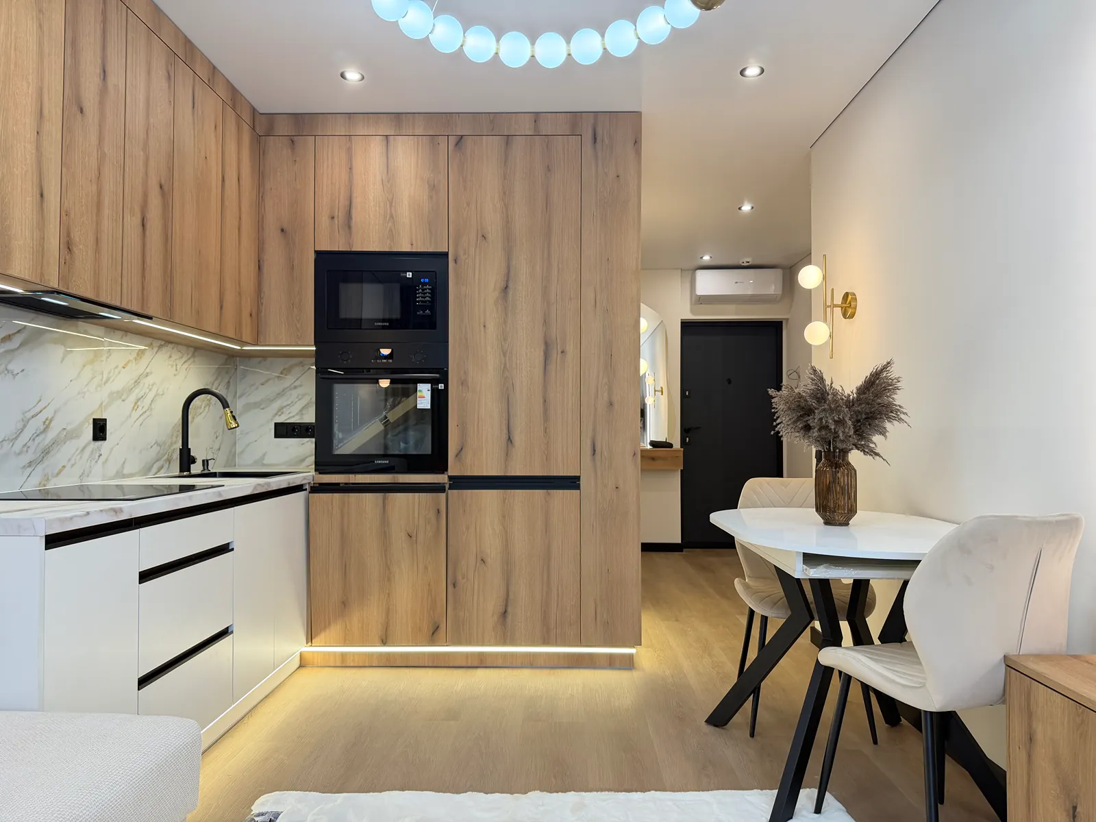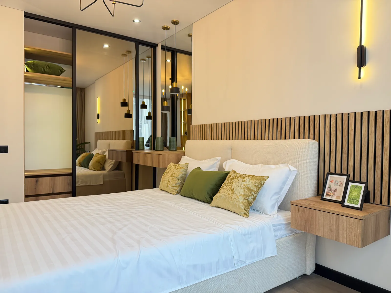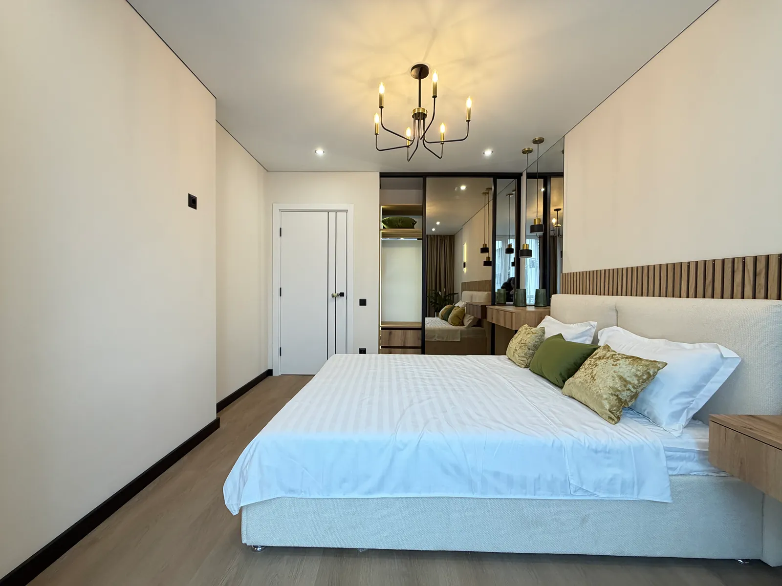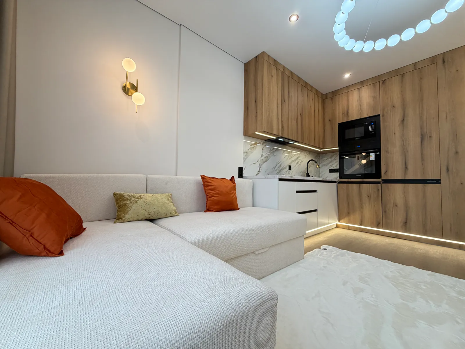 На кухні вмонтована вся необхідна техніка та меблі. В спальні є двоспальне ліжко з підйомним механізмом, приліжкові тумби та місце для телевізора.