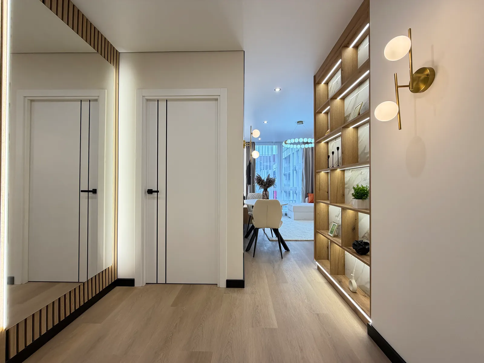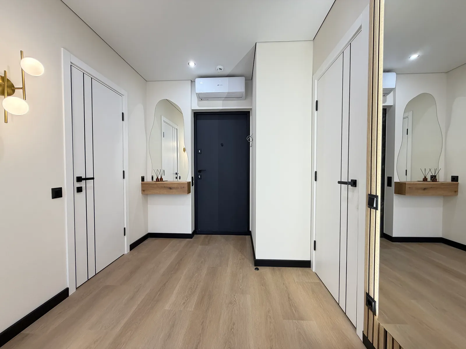 Квартира розташована на десятому поверсі з тринадцяти та має загальну площу 43м2. Планування квартири включає в себе: кухню-студію, спальню, санвузол та великий гардероб.