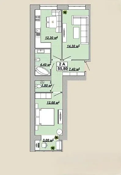 Квартира має функціональну площу 55.8м2 та продумане двостороннє планування: