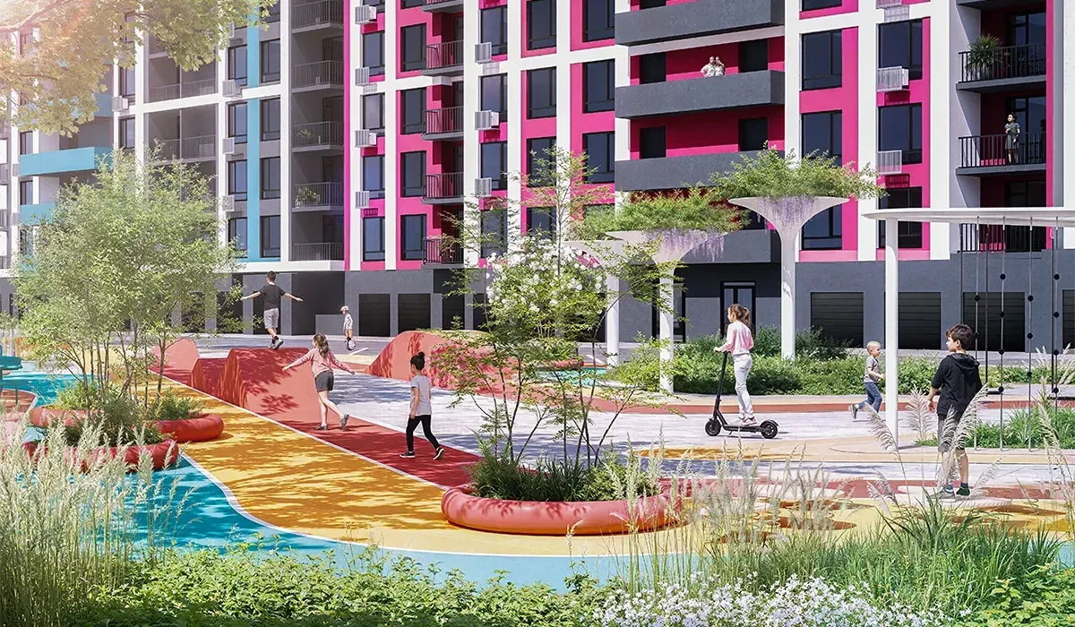 Житловий комплекс передбачає каскадну поверховість з найвищими в Івано-Франківську будинками 19 поверхів. Закритий двір, спортивне поле, великий дитячий майданчик, торговий центр, підземний паркінг, велопарковка. Велика прибудинкова green-зона площею 30 тис. кв. м та відсутність тісної забудови даруватиме відчуття свободи.