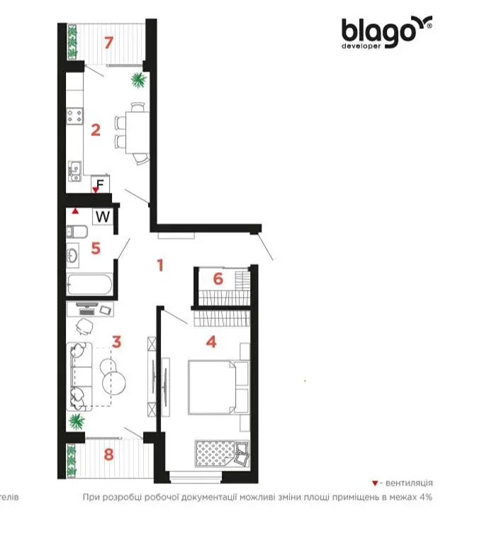 Квартира розташована на зручному другому поверсі, загальна площа 71м2, має двостороннє планування.