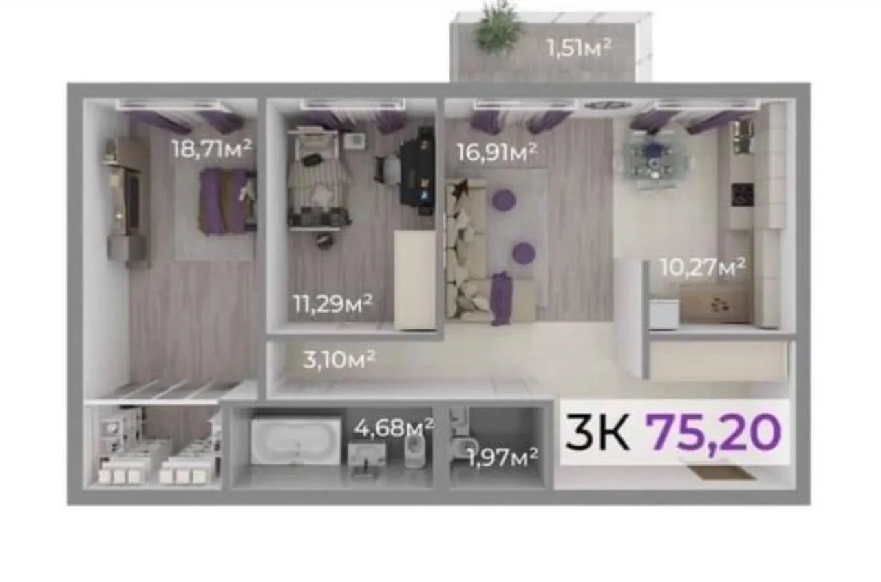 Трикімнатна з балконом та терасою у ЖК Долішній