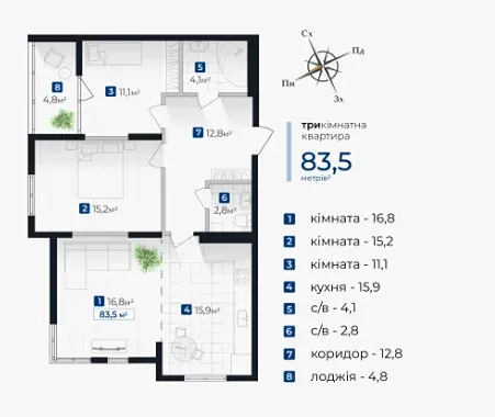 Квартира розташована на пятому поверсі та має функціональне планування загальною площею 83.5м2, воно включає в себе прихожу з гардеробом, роздільний санвузол, велику кухню-студію,та дві просторі спальні.