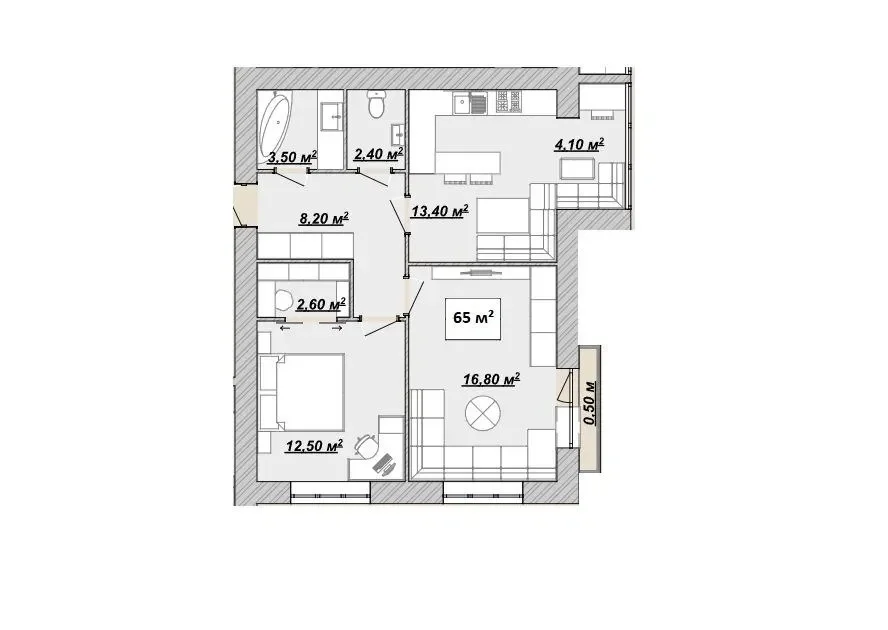 Загальна площа квартири складає 65м2. Квартира має: дві окремі кімнати, велику кухню та просторий санвузол.